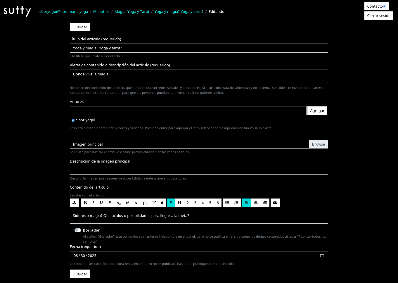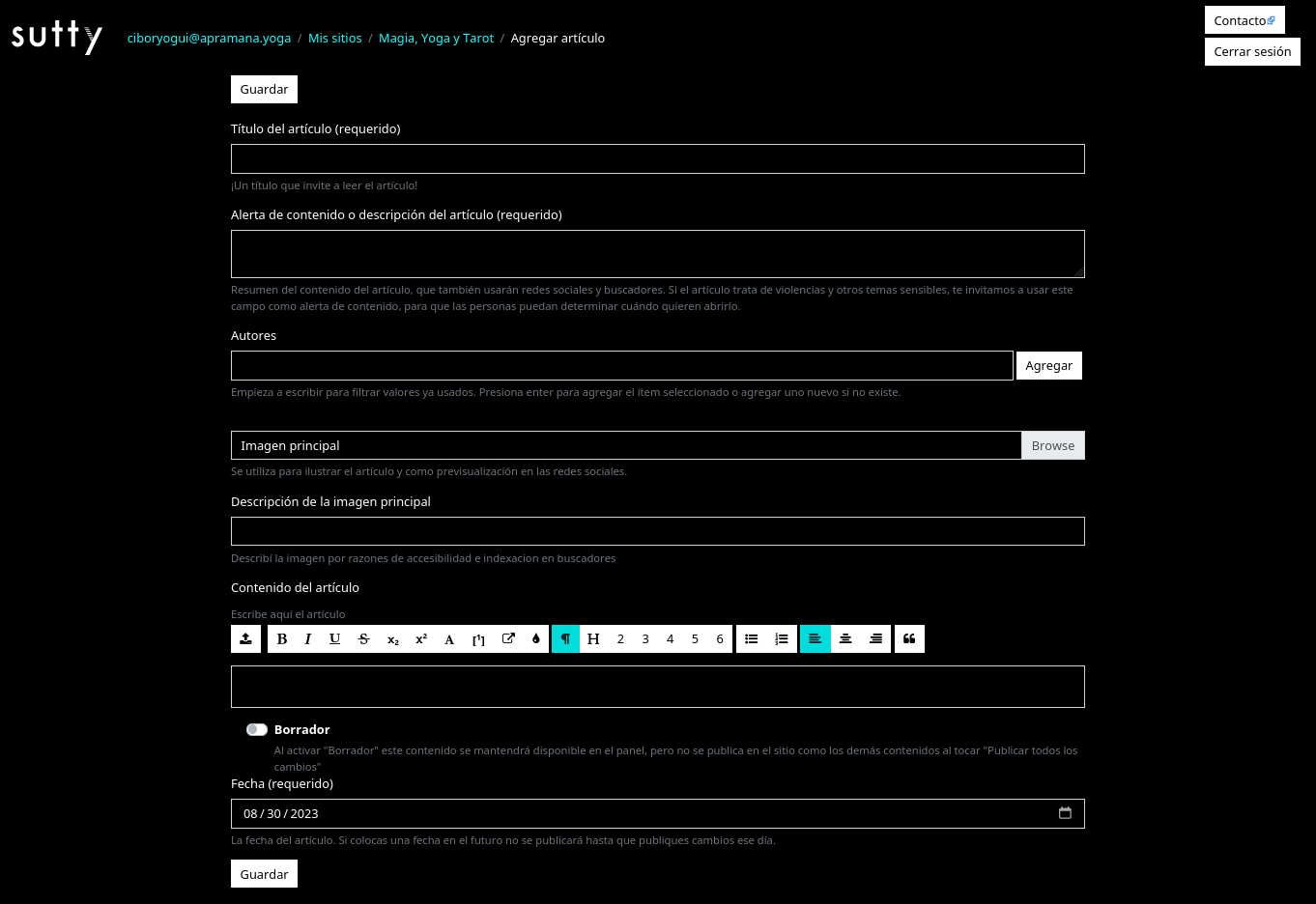 Debes presionar el botón Agregar para el tipo de contenido Artículo. Serás redirigide a la pantalla para crear tu artículo. Allí, deberás elegir un título, que será mostrado en la página principal en un listado junto a los otros títulos de tus demás artículos. Además, es importante que completes la descripcion para contar de qué se trata y atraer a les lectores. Opcionalmente, podrás agregar une o varies autores y una o más imágenes con su correspondiente descripción.