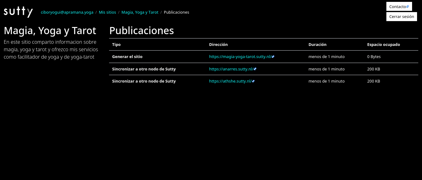 En la siguiente ventana, tendrás una lista con direcciones. La primera es la direccion de tu sitio, ¡qué alegría! Las siguientes, por ahora, te indican los servidores de Sutty en los que se encuentra disponible. No es necesario que hagas nada, pero si haces clic en en el primer enlace, el que contiene la dirección que elegiste para tu sitio, podrás acceder a la primera versión, que todavía no contiene artículos.