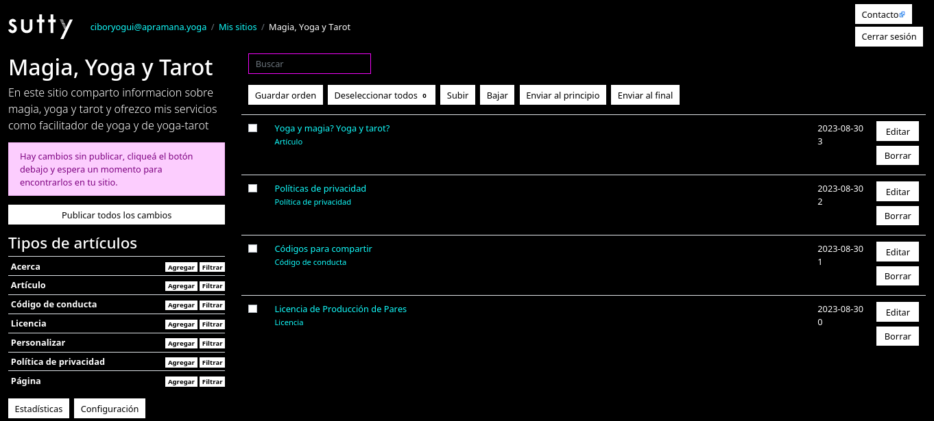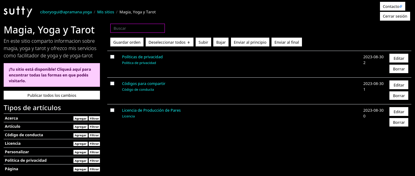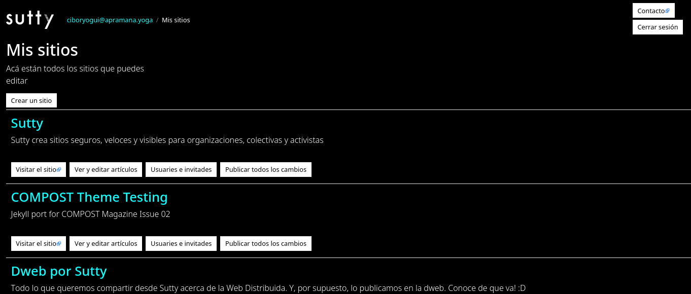 ¡Felicidades! Tu primer sitio está listo. Ahora serás redirigide al panel de tu sitio, donde se listan, en el centro, tus artículos o posts disponibles. ¡No te preocupes si encuentras tres artículos allí! Son los que Sutty agrega por defecto y aparecerán al pie de página; contienen información sobre la Política de Privacidad, Acuerdos de convivencia y Licencia del sitio. Puedes dejarlos así, editarlos o incluso borrarlos.