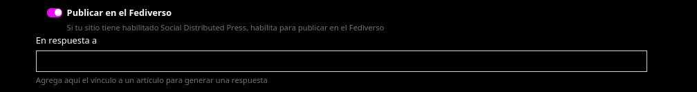 Cuando empieces a recibir respuestas a tus publicaciones, recuerda que puedes responderlas, a su vez, creando un artículo nuevo en tu sitio y copiando la URL en el campo “En respuesta a”, debajo del botón “Publicar en el Fediverso”.