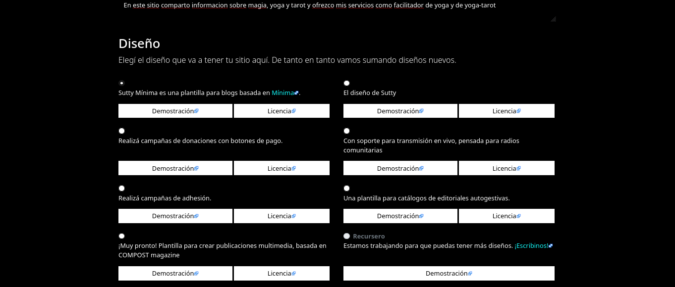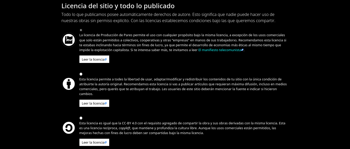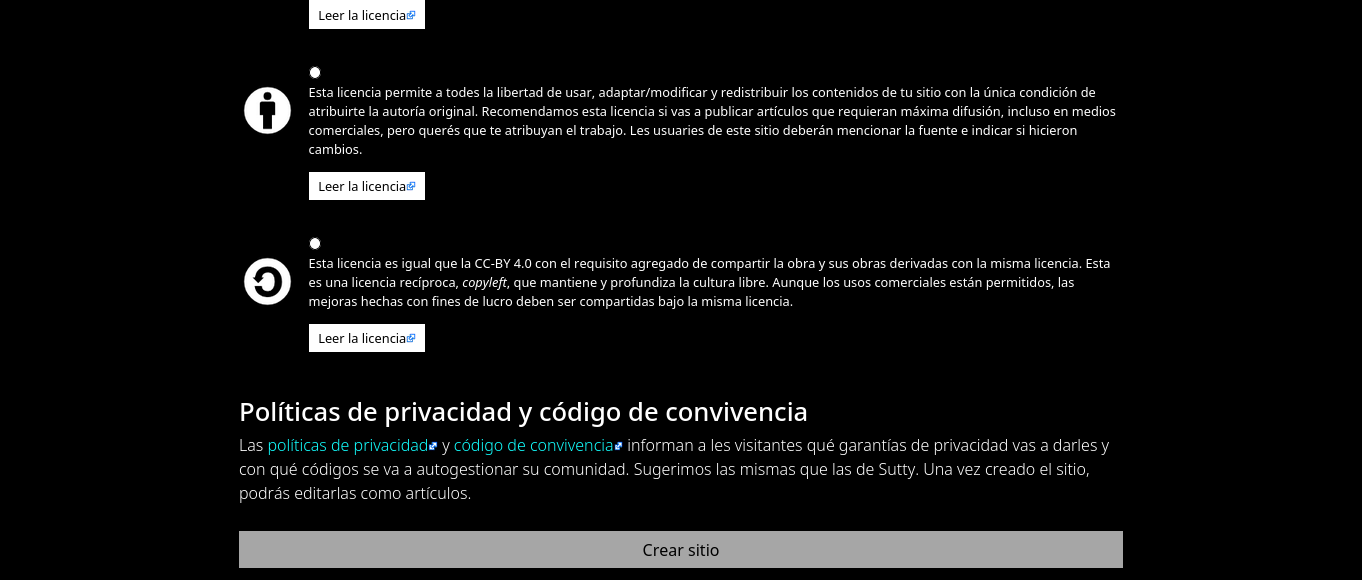 Por último, necesitarás elegir una licencia para tu sitio y todo el contenido que publiques en él. Sutty ofrece tres tipos posibles. También puedes usar tu licencia personalizada. Recuerda que cuando no seleccionas una licencia, todos los derechos están reservados. Encontrarás una breve descripcion de cada una y, si tienes dudas, puedes presionar el botón “leer mas”, que te enviará a un sitio con más información sobre cada tipo de licencia.