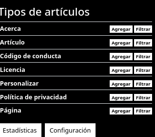 Para crear tu primer artículo, encontrarás en el panel izquierdo el listado de los tipos de contenido que puedes agregar(o encontrar agrupados con la opción de filtrar).