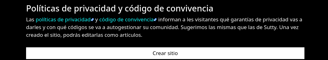 Con esto tienes lo básico de cómo utilizar el CMS. De aquí en adelante puedes agregar más artículos, experimentar con personalizar la plantilla, y probar otras opciones de formato en el editor de texto enriquecido de Sutty. Si necesitas ayuda con el panel, o quieres crear diseño propio, puedes comunicarte con Sutty directamente.
