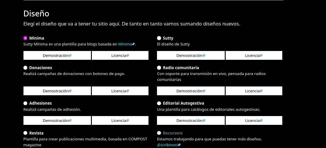 Para la sección de Diseño, selecciona la plantilla de Mínima, que es uno de los temas por defecto de Jekyll.
