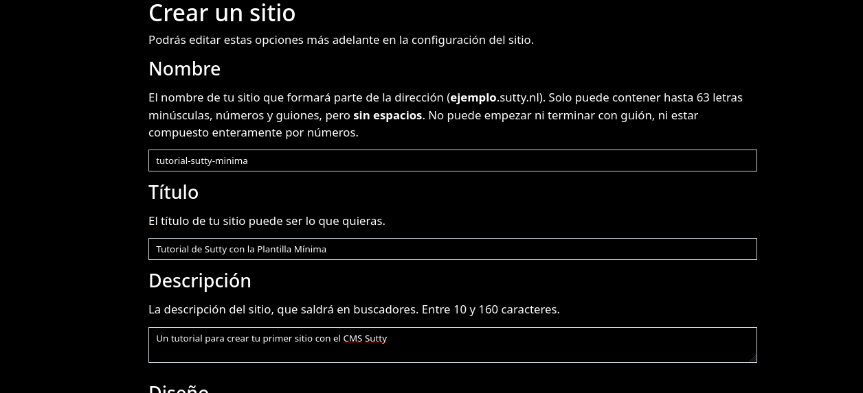 El paso más importante es elegir un nombre único para tu sitio. Para este tutorial vamos a utilizar el nombre tutorial. Esto será usado para el dominio de tu sitio. Por ejemplo, a nuestro sitio se podrá acceder mediante https://tutorial-sutty-minima.sutty.nl.