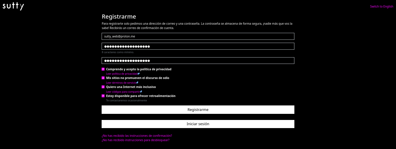Visita https://panel.sutty.nl/usuaries/sign_up y completa con tu email y una contraseña segura. También debes aceptar los términos de servicio de Sutty para crear tu cuenta.